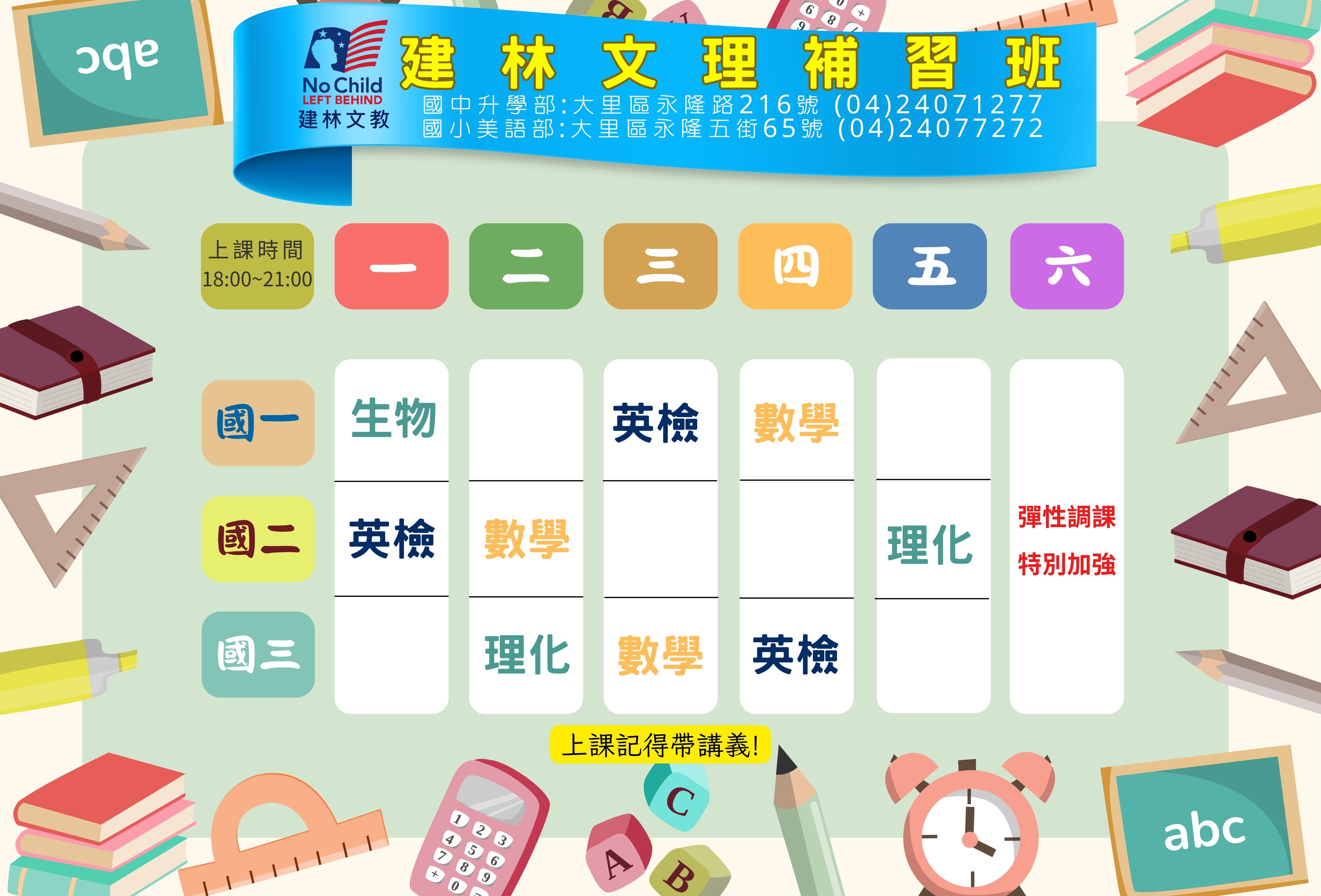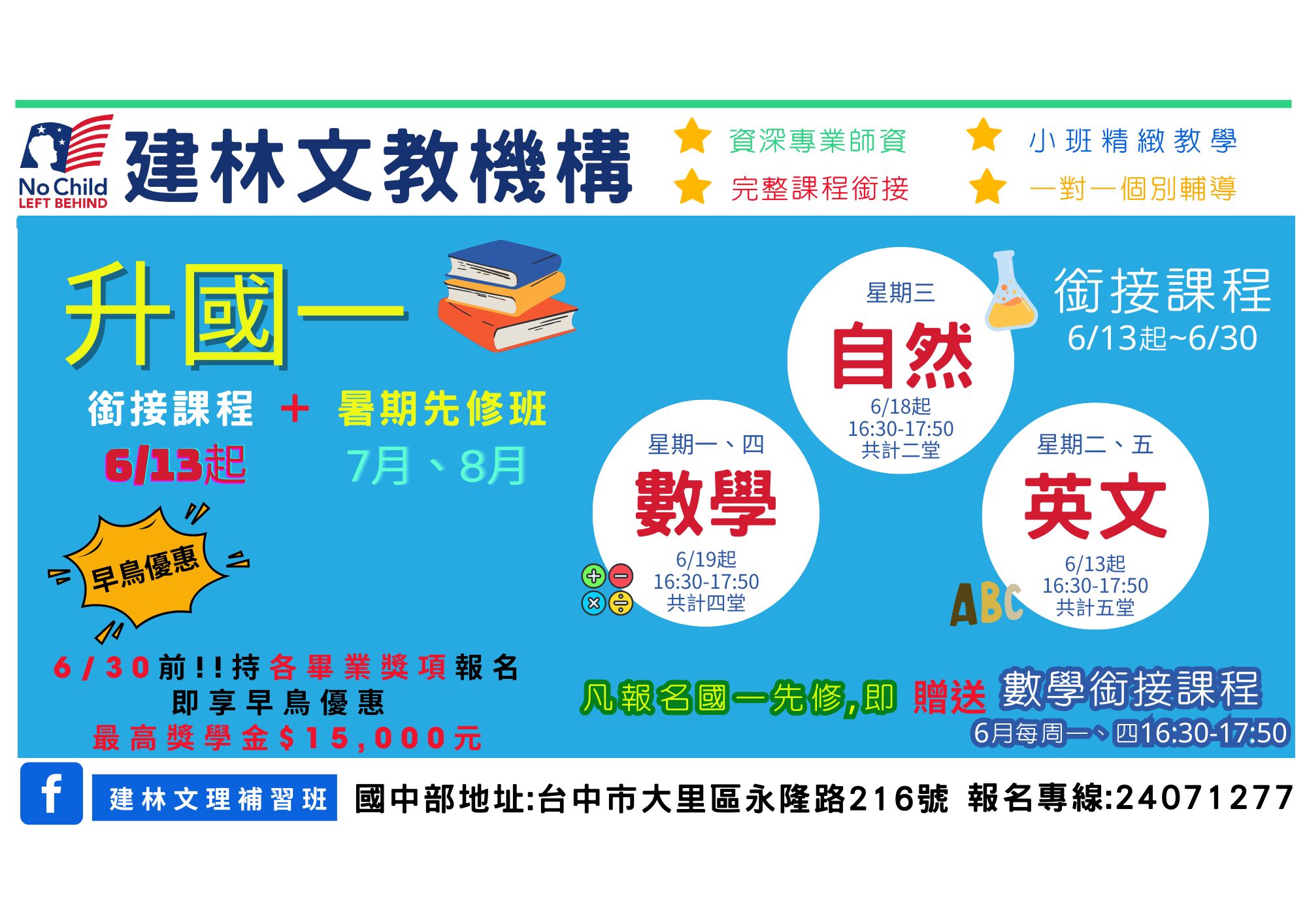 【建林小六升國一夏令營】(全日)■課程期間:2025/7/1~2025/8/22夏令營全日課程七、八月(上午~下午學習活動/課業輔導/團體互動)七月:(共計23全日)八月:(共計5全日+11半日)■課程內容:夏令營課程內容包含:課業輔導、主題探索、作業練習時間、選修活動、科學體驗、影片欣賞、體能活動、桌遊與多元生活學習,兼顧作息規律與自主能力養成。完整作息安排、有系統的三科授課,有效幫助孩子從國小畢業後無縫接軌進入國中學習節奏。名額有限,請盡速報名完成繳費,保障孩子完整參與與優先名額。【建林小六升國一先修班】■課程期間:2025/7/1~2025/9/30(採季繳)或2025/7/1~2025/12/31(採半年繳)國一先修課程:(英文/數學/自然可選科及選擇三個月季繳或半年繳)■課程內容本班國一先修班特色:1.國英數自然全面銜接,強化段考實力2.國中課程先修打底,提早銜接不落後3.精準預習國中重點,強化理解與解題力4.專業師資帶領先修,奠定國一學科基礎5.提前掌握國一課程,順利銜接無壓力暑假期間本班針對暑假升國一新生精心設計以上兩種課程,可按實際需求搭配報名。【報名提醒】本班課程規劃完整、作息穩定、課業與活動兼具,讓孩子從容銜接國中生活。名額有限,建議儘早完成報名與繳費,以享完整課程與優惠折扣!※完整費用明細與課表可洽詢主任或至櫃檯領取。※請務必於2025年6月20日(五)前完成報名與訂金繳交,名額有限,額滿即止!※過期未繳者恕不保留優惠與名額,請及早完成報名手續。地址:台中市大里區永隆路216號電話:(04)2407-1277建林文理補習班國中部