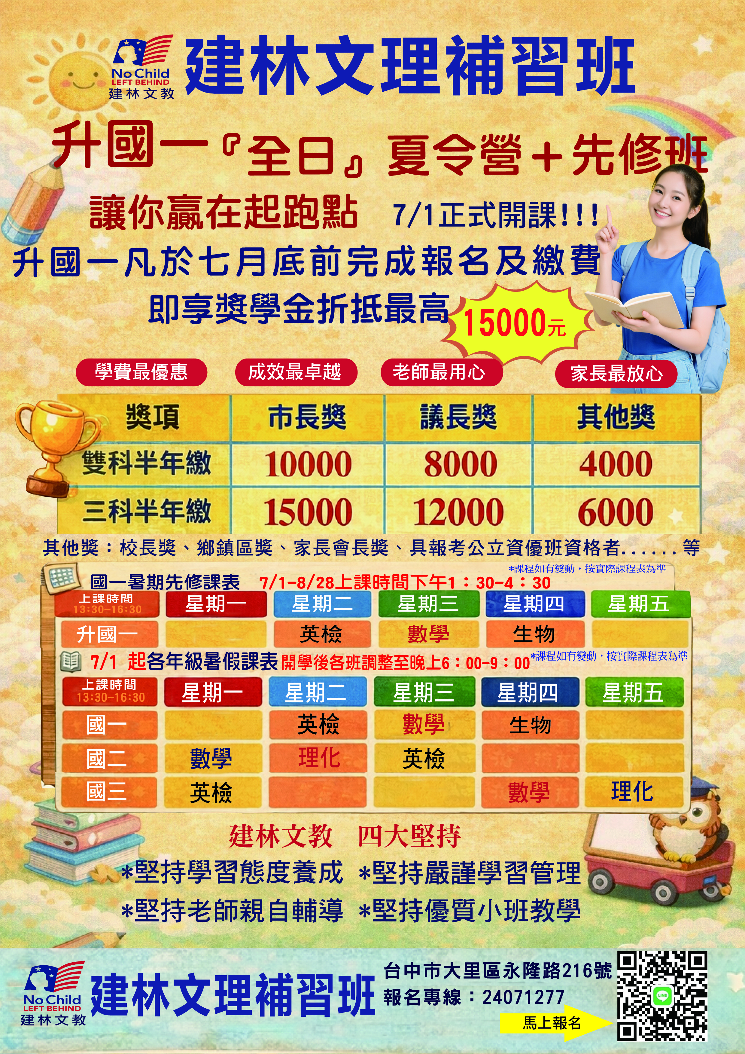 【建林小六升國一夏令營】(全日)■課程期間:2025/7/1~2025/8/22夏令營全日課程七、八月(上午~下午學習活動/課業輔導/團體互動)七月:(共計23全日)八月:(共計5全日+11半日)■課程內容:夏令營課程內容包含:課業輔導、主題探索、作業練習時間、選修活動、科學體驗、影片欣賞、體能活動、桌遊與多元生活學習,兼顧作息規律與自主能力養成。完整作息安排、有系統的三科授課,有效幫助孩子從國小畢業後無縫接軌進入國中學習節奏。名額有限,請盡速報名完成繳費,保障孩子完整參與與優先名額。【建林小六升國一先修班】■課程期間:2025/7/1~2025/9/30(採季繳)或2025/7/1~2025/12/31(採半年繳)國一先修課程:(英文/數學/自然可選科及選擇三個月季繳或半年繳)■課程內容本班國一先修班特色:1.國英數自然全面銜接,強化段考實力2.國中課程先修打底,提早銜接不落後3.精準預習國中重點,強化理解與解題力4.專業師資帶領先修,奠定國一學科基礎5.提前掌握國一課程,順利銜接無壓力暑假期間本班針對暑假升國一新生精心設計以上兩種課程,可按實際需求搭配報名。【報名提醒】本班課程規劃完整、作息穩定、課業與活動兼具,讓孩子從容銜接國中生活。名額有限,建議儘早完成報名與繳費,以享完整課程與優惠折扣!※完整費用明細與課表可洽詢主任或至櫃檯領取。※請務必於2025年6月20日(五)前完成報名與訂金繳交,名額有限,額滿即止!※過期未繳者恕不保留優惠與名額,請及早完成報名手續。地址:台中市大里區永隆路216號電話:(04)2407-1277建林文理補習班國中部