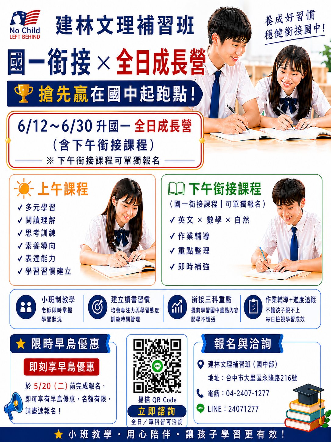 2026-04-25 建林小六升國一 銜接 × 先修課程 小六畢業後,國中的關鍵起跑點 就從這個暑假開始 【6/12~6/30 國一銜接課程+全日成長營】 【 7/1~8/31 國一先修課程+全日夏令營】
